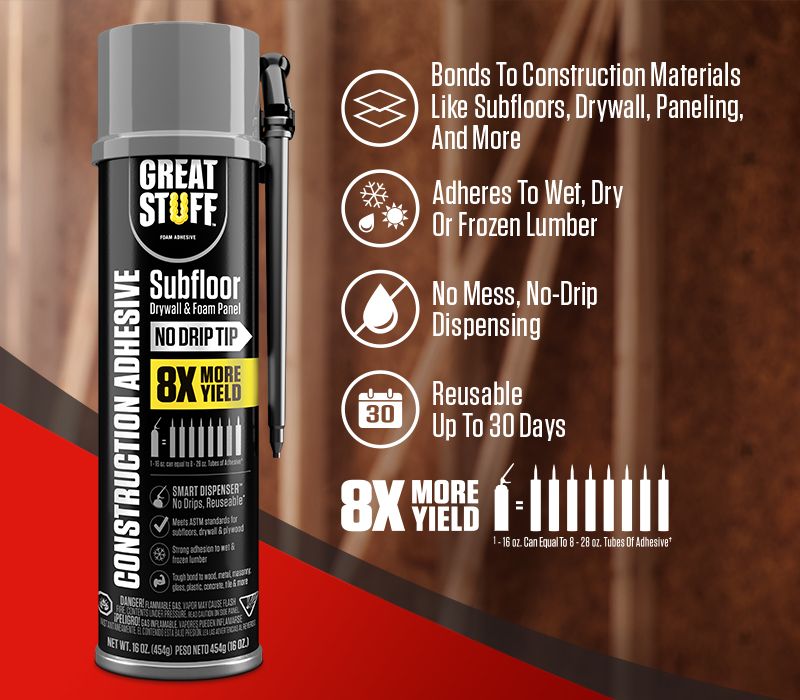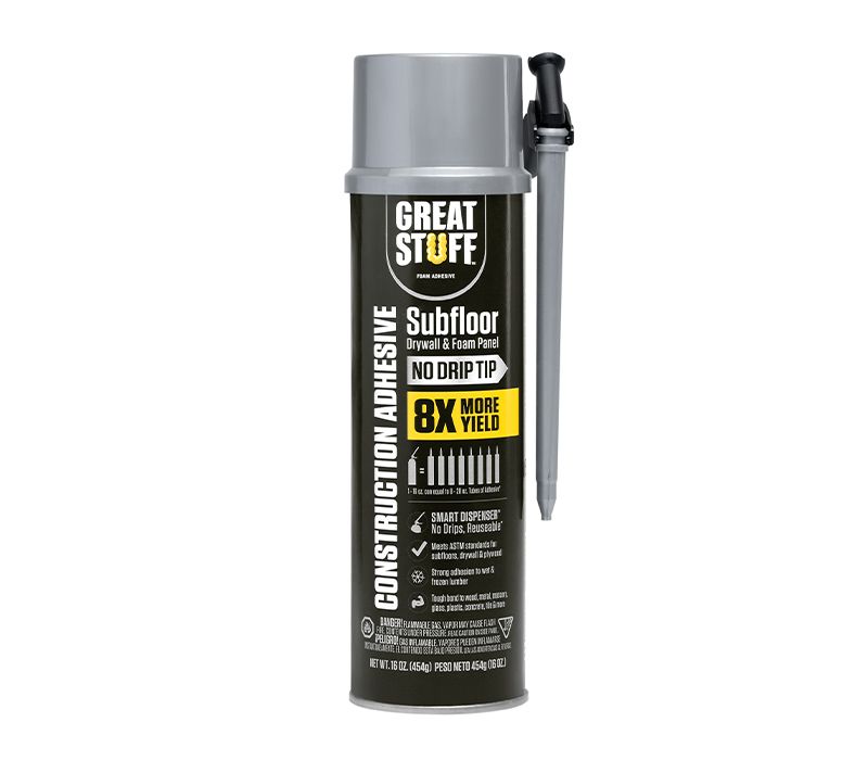 GREAT STUFF™ Construction Adhesive is a heavy-duty, moisture-cured adhesive specially formulated to bond subfloors, drywall, paneling, foam panels and most construction materials. It's unique polyurethane foam formula is easier to apply than traditional construction adhesives, and delivers 8 times more yield. Plus, the GREAT STUFF™ Smart Dispenser™ nozzle delivers exceptional control, no-drip dispensing, and is re-startable for up to 30 days when left attached to the product.