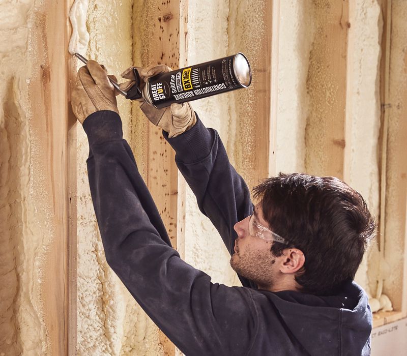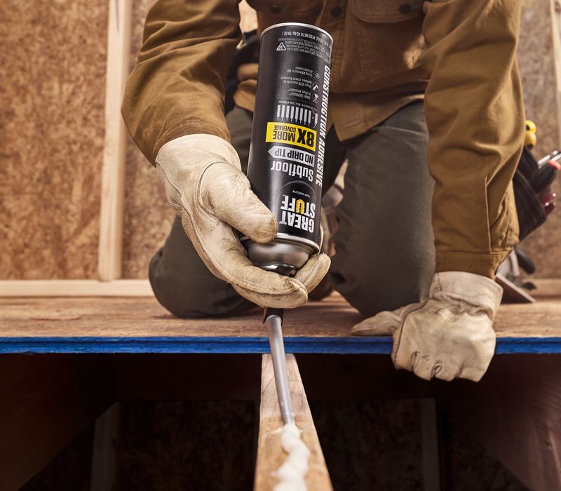 Heavy-duty bonds, regardless of weather, GREAT STUFF Construction Adhesive provides a fast-grab tack and long-term bond to most construction materials, helping reduce nail-pops and squeaks.