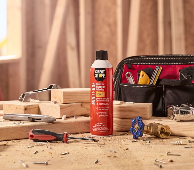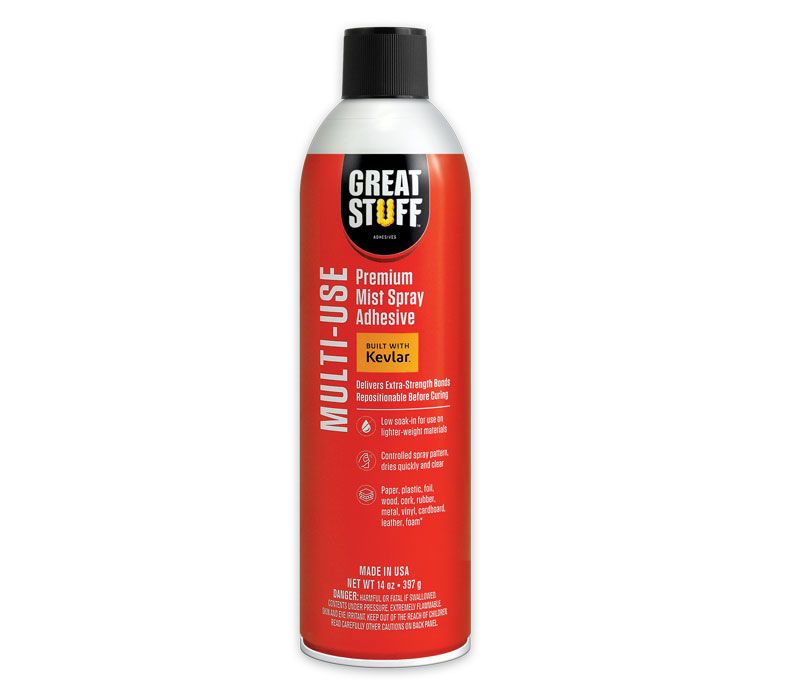 Multi-Use Mist Adhesive provides long-lasting, strong and versatile bonds. This low soak-in formula is repositionable before curing. Controlled spray pattern dries quickly and clear. Preferred choice for lighter-weight materials such as plastic sheeting, foil, wood, cork, cardboard, leather, foam, paper and more. Common applications include contractor jobs, woodworking, fiberglass insulation, hard & porous surfaces, wallpaper & fabric, and jobsite plastic film.