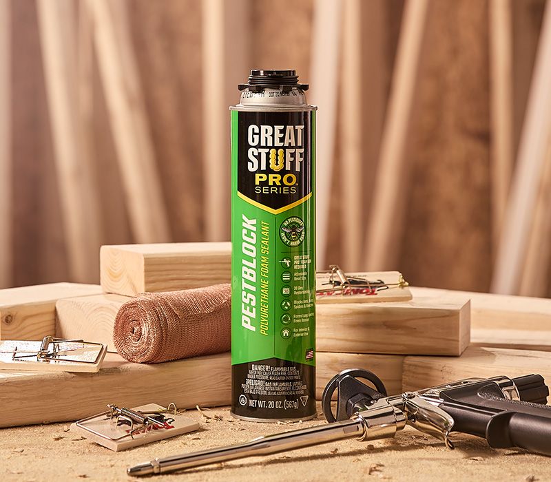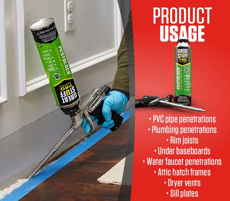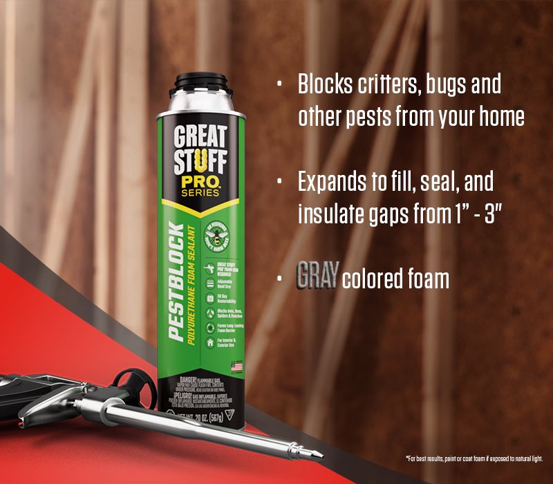 GREAT STUFF PRO™ Pestblock Polyurethane Foam Sealant is a gun-applied, insulating foam sealant that expands up to 3 inches to take the shape of gaps, creating a long-lasting, airtight and water-resistant seals that control spiders, ants, cockroaches, rats, and more from entering the home without the use of pesticides.